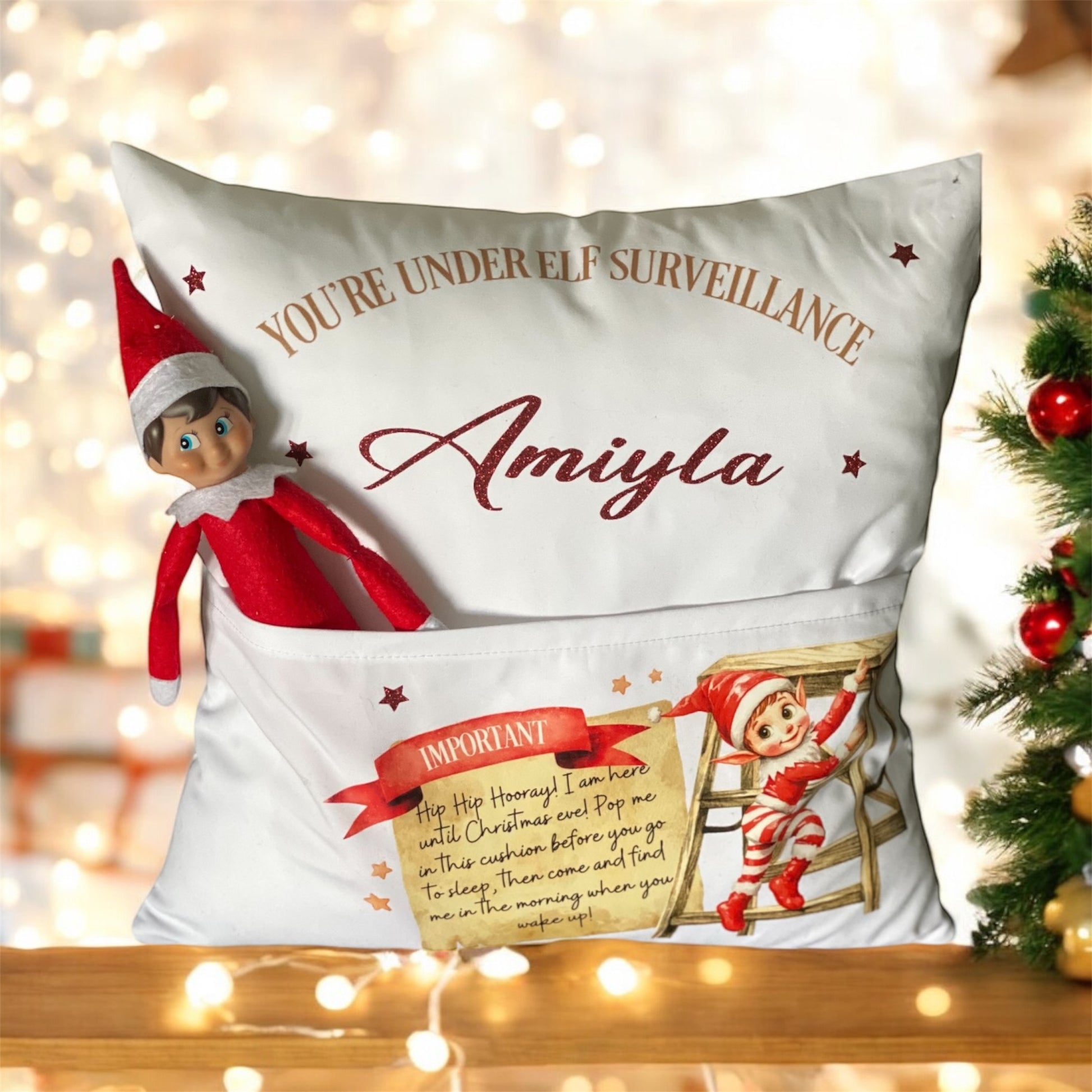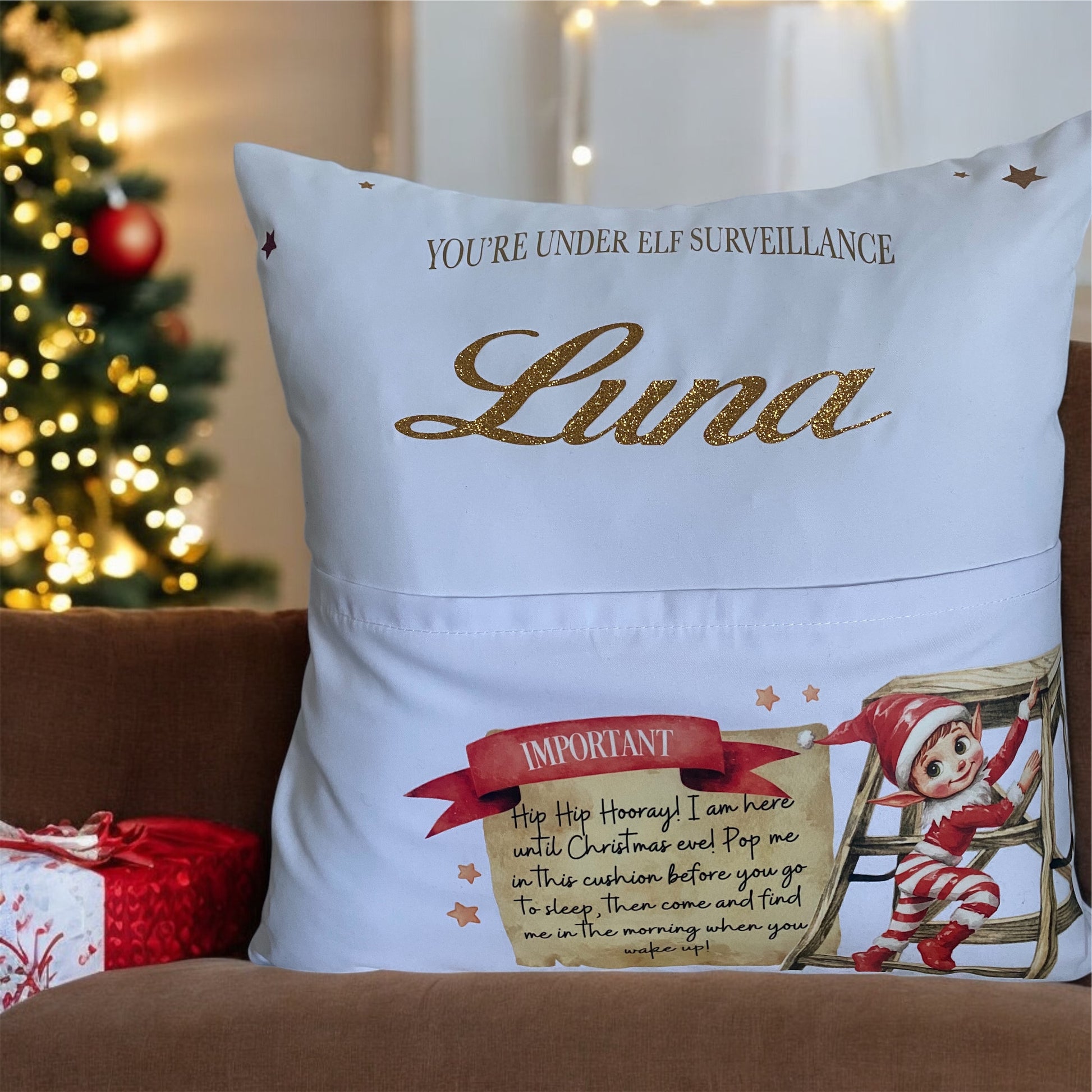 Elf pocket cushion cover personalised with name/s.