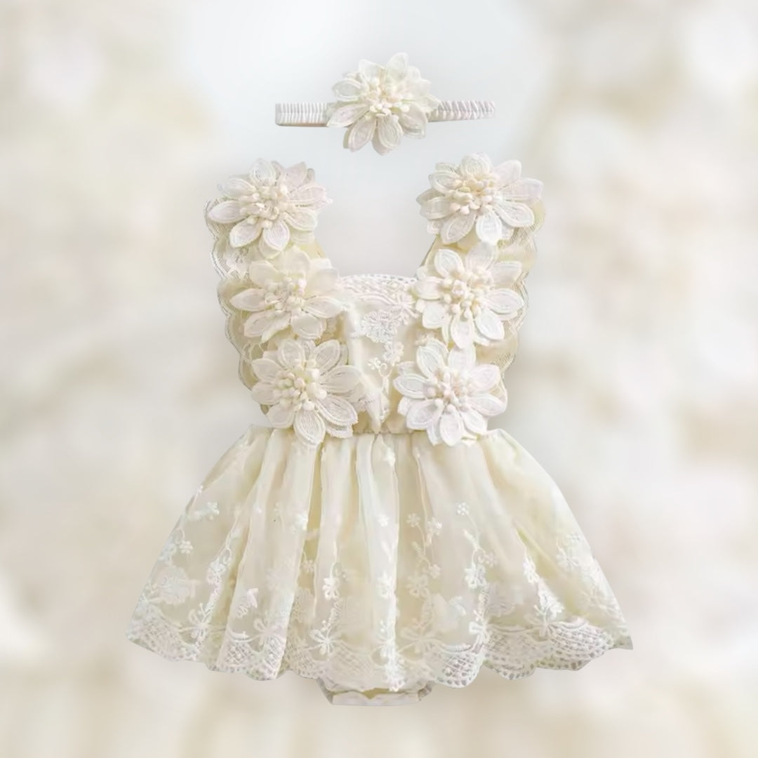 Floral lace romper with matching headband, cross over ribbon tie at the back.